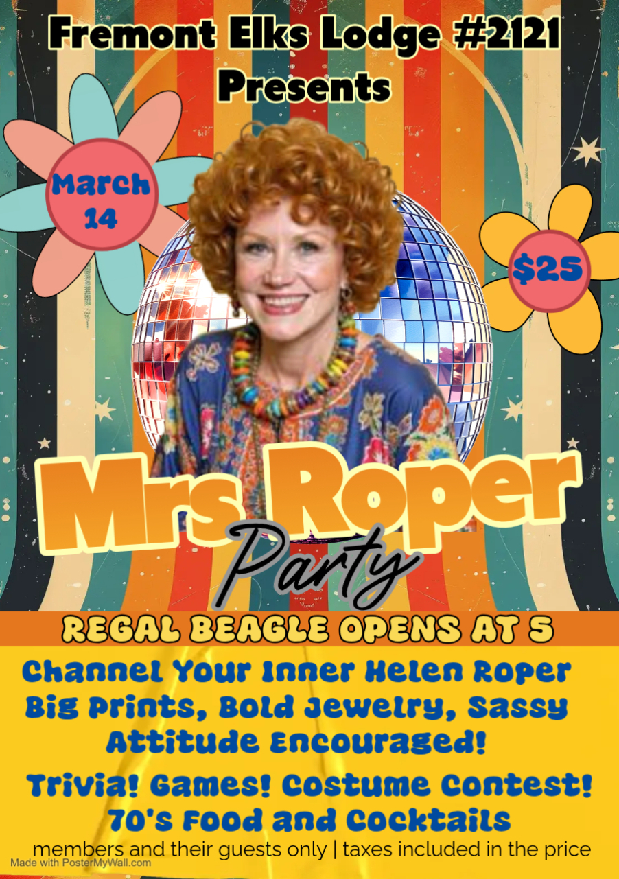 Channel your inner Helen Roper and break out your big print kaftan, bold jewelry, oversize sunglasses and sassy attitude at our Mrs. Roper Party on March 14