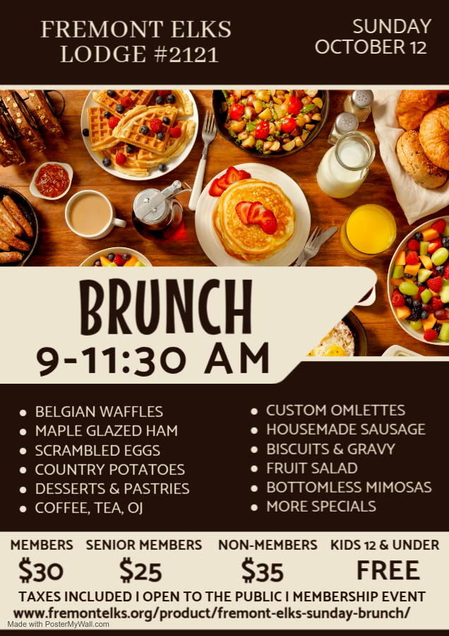 We are excited to invite you to our brunch on Sunday October 12th, from 9 AM to noon. This is a perfect opportunity to enjoy great food and learn about the Elks!
