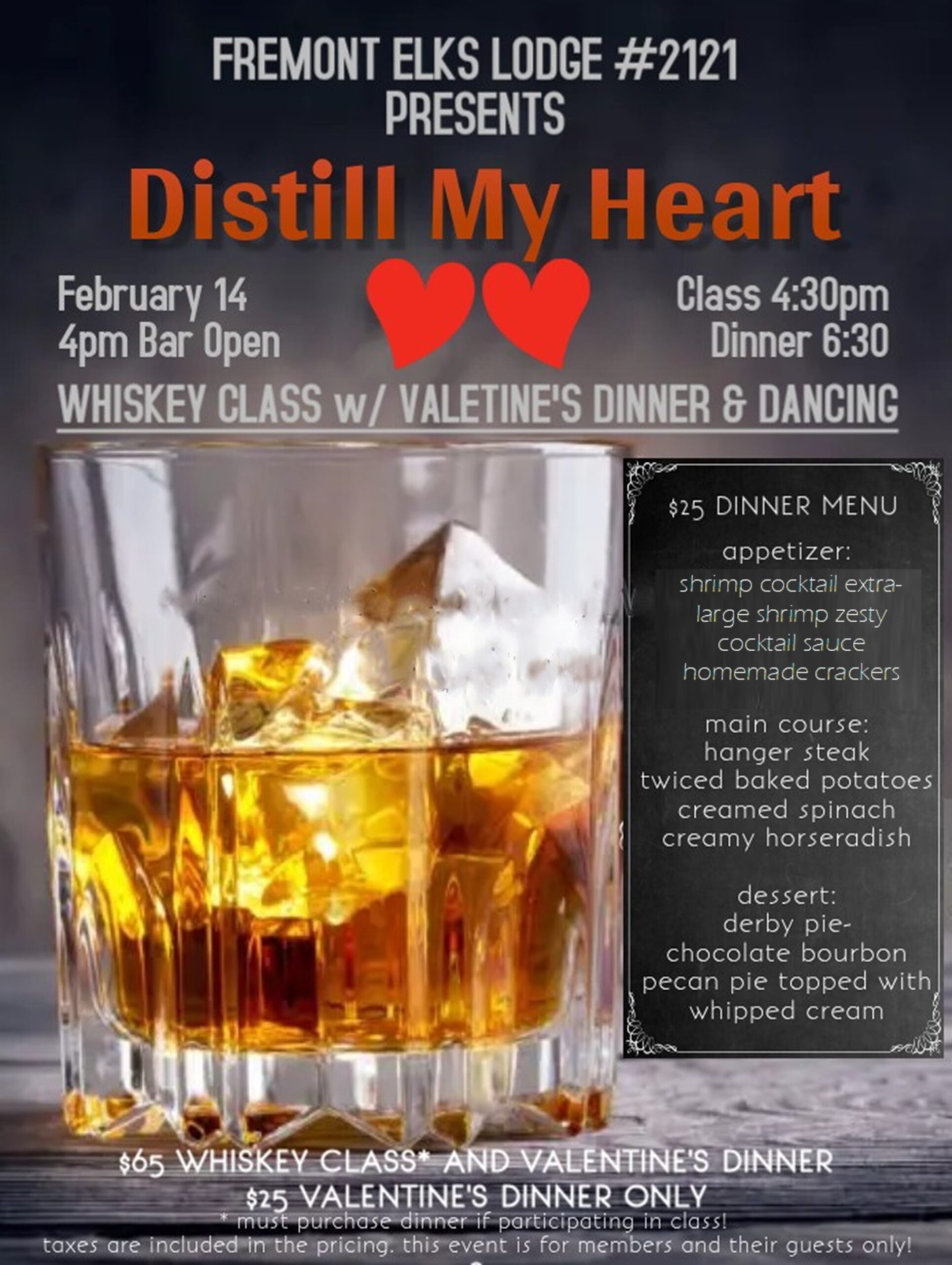 Don’t miss this fun night of eating, dancing, and whiskey tasting at the Fremont Elks Lodge #2121 for our “Distill My Heart” Valentine’s Day celebration!