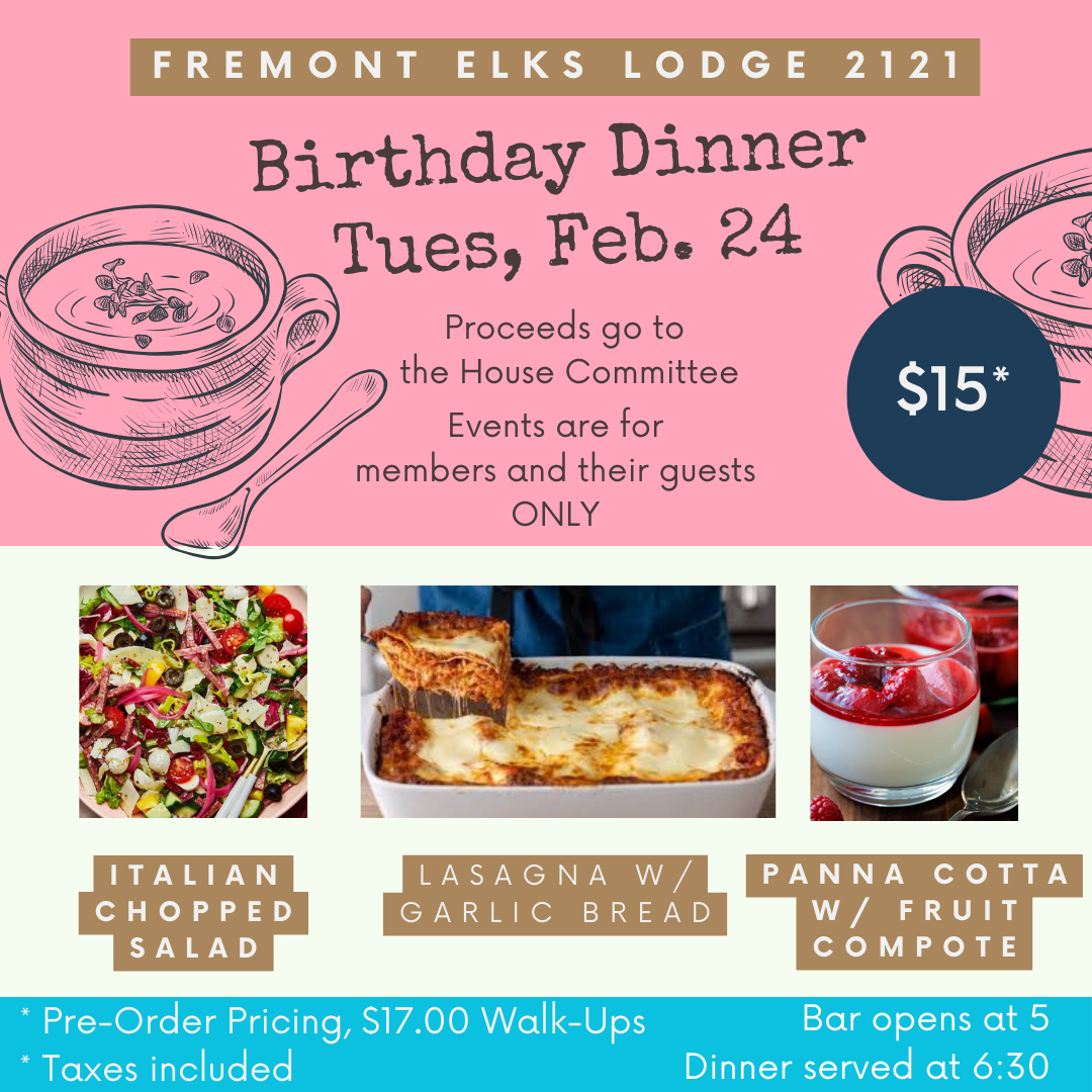 Italian Chopped Salad, Housemade Lasagna with Bolognese Sauce, Garlic Bread, Panna Cotta with Seasonal Fruit Compote
